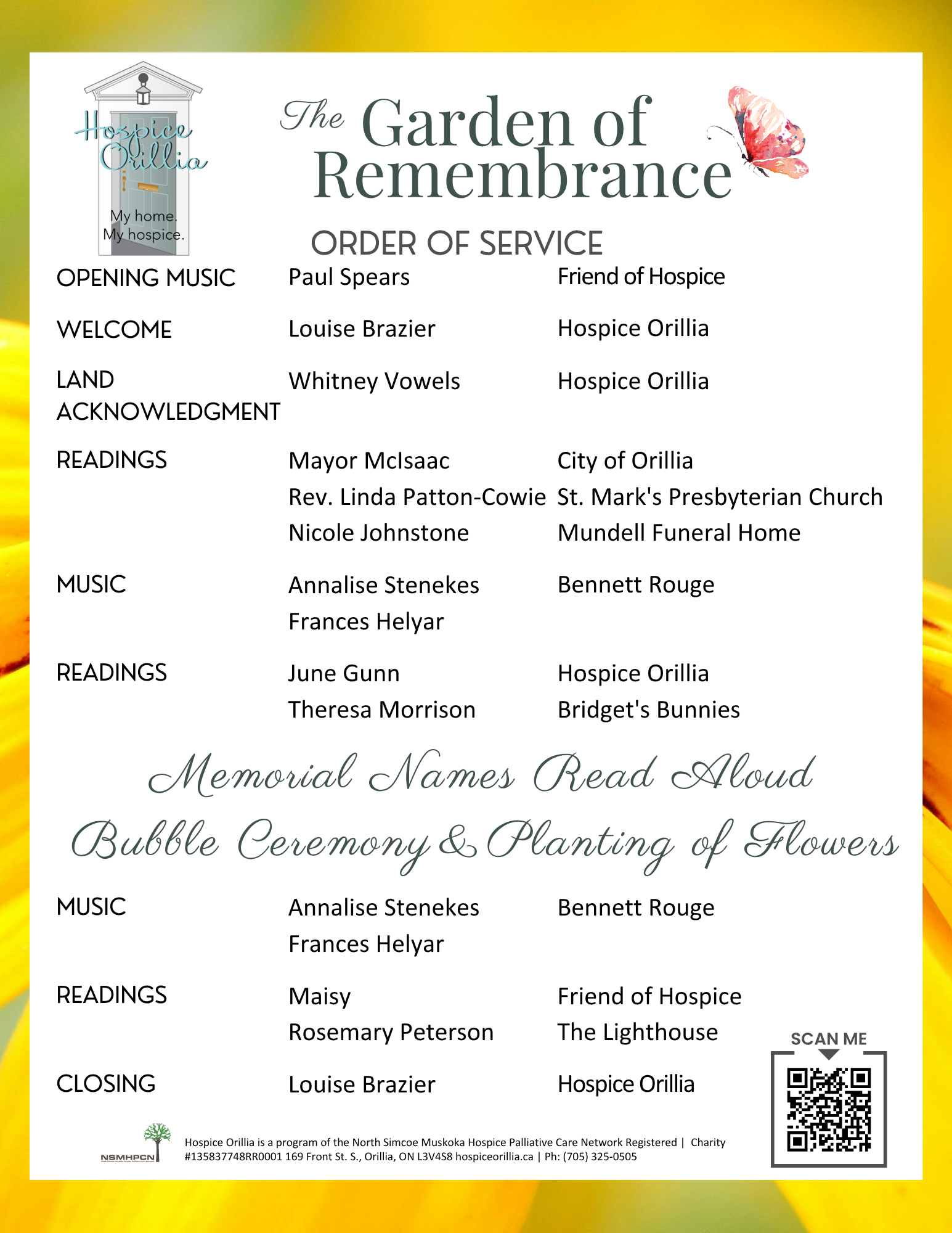 The 2025 Garden of Remembrance will take place Wednesday, June 25th at 6:30 pm at Couchiching Beach Park in Orillia.
